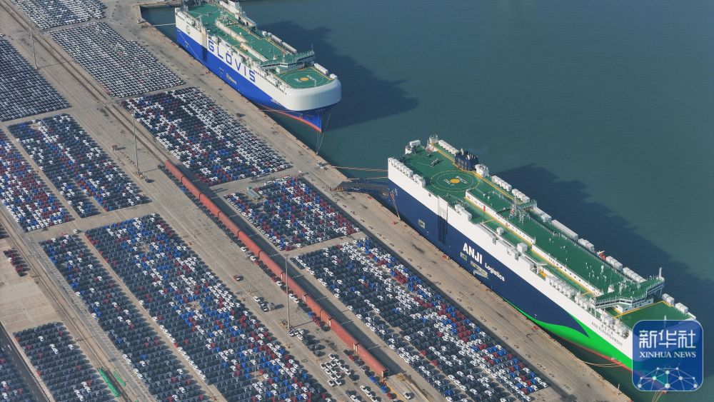 ↑ 12月14日在江蘇省港口集團(tuán)南京港龍?zhí)都b箱碼頭拍攝的等待裝船出口的國(guó)產(chǎn)汽車(無(wú)人機(jī)照片)。新華社發(fā)(楊素平攝)