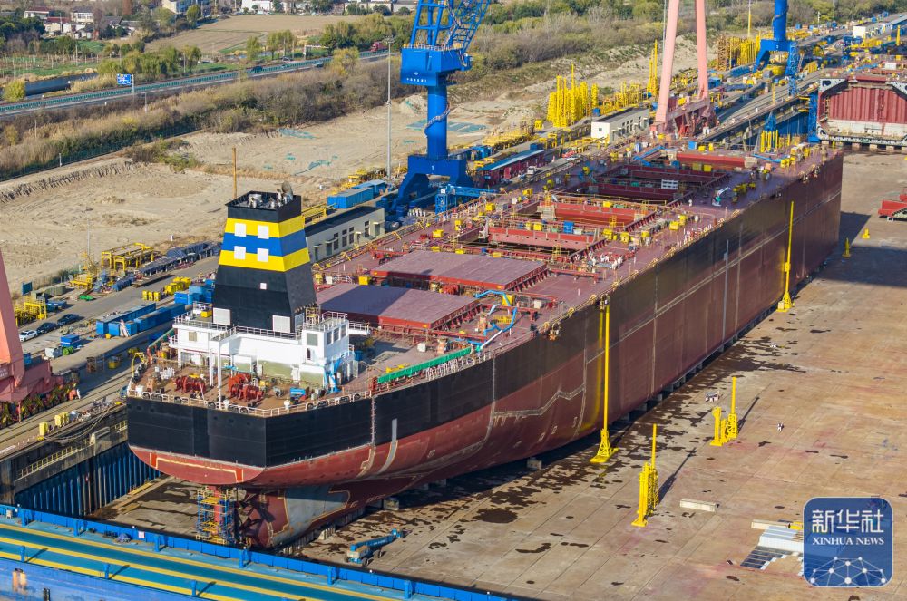 ↑ 12月15日,在江蘇南京招商工業(yè)南京金陵船廠生產(chǎn)廠區(qū),大型船舶在建造中(無(wú)人機(jī)照片)。新華社發(fā)(辛一攝)