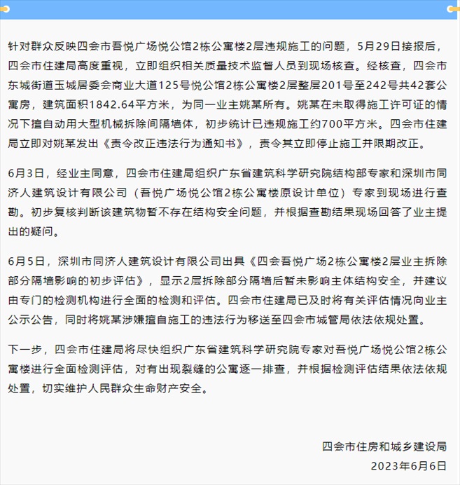 ·業(yè)主買42套房欲打通全部墻體,當地通報:責令其立即停止施工并限期改正。