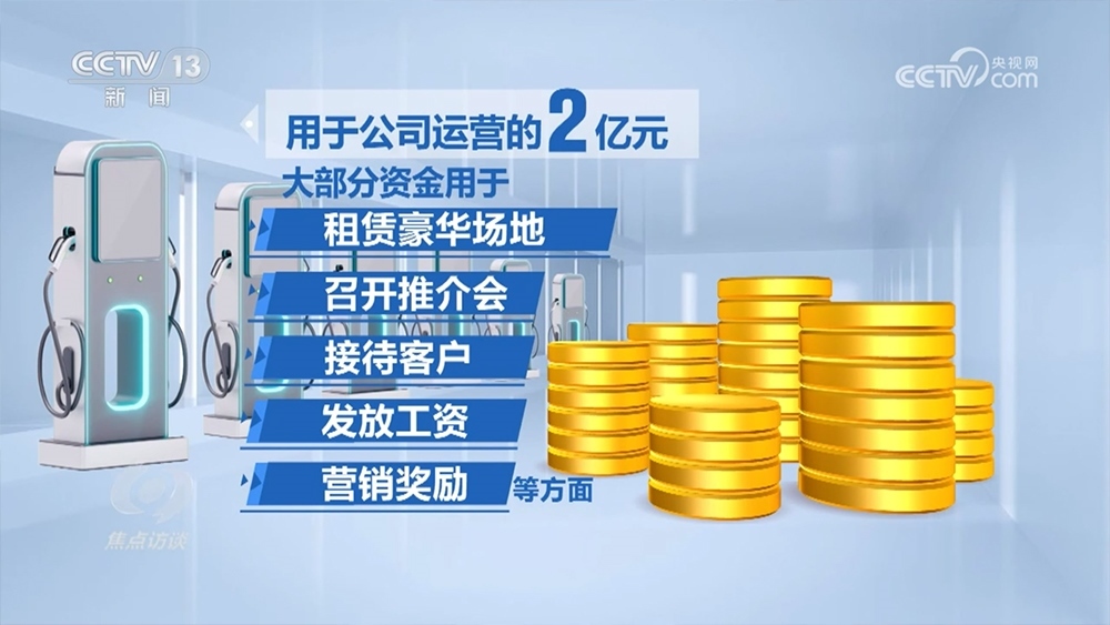 用于公司運(yùn)營的2億元,大部分資金用于租賃豪華場地、召開推介會、接待客戶、發(fā)放工資、營銷獎勵等方面。實際僅修建充電樁123個,用資僅1000多萬元,僅占資金總額的1%。