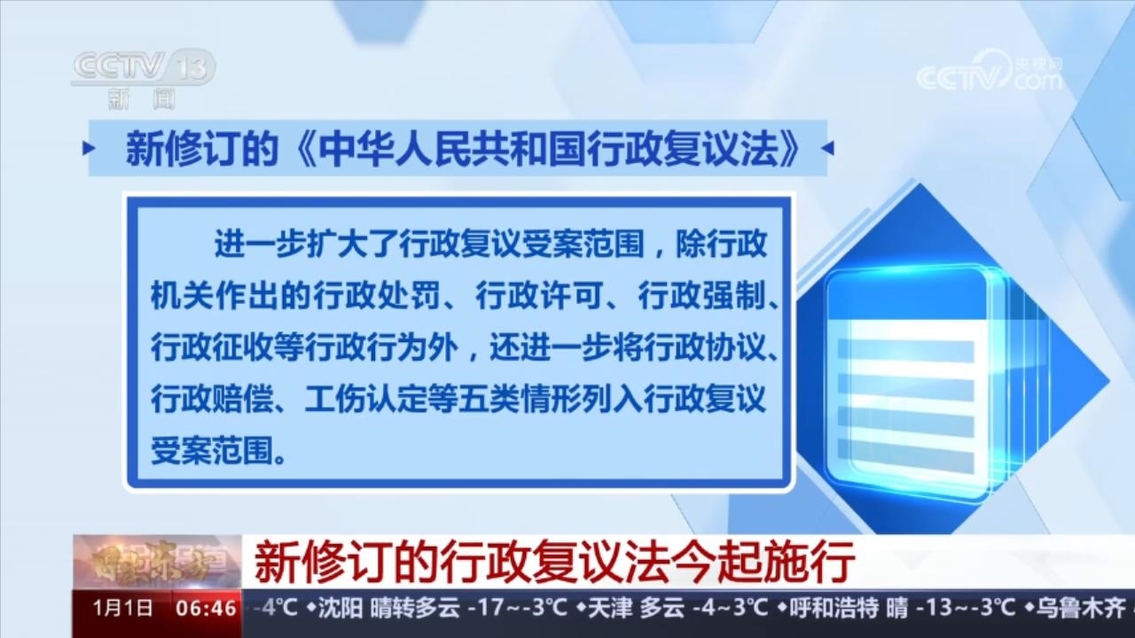 新修訂《中華人民共和國行政復議法》1月1日起施行,法律進一步擴大了行政復議受案范圍,除行政機關(guān)作出的行政處罰、行政許可、行政強制、行政征收等行政行為外,還進一步將行政協(xié)議、行政賠償、工傷認定等五類情形列入行政復議受案范圍。