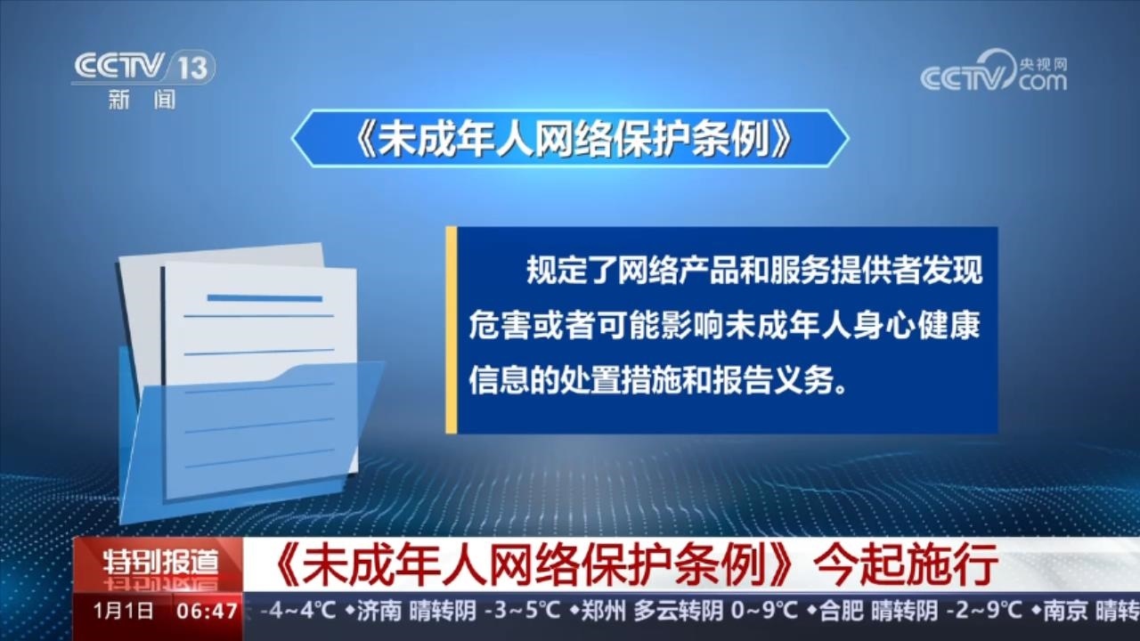 1月1日起施行的《未成年人網(wǎng)絡(luò)保護條例》是我國第一部專門性的未成年人網(wǎng)絡(luò)保護綜合立法。條例規(guī)定,網(wǎng)絡(luò)產(chǎn)品和服務提供者發(fā)現(xiàn)危害或者可能影響未成年人身心健康信息的處置措施和報告義務。