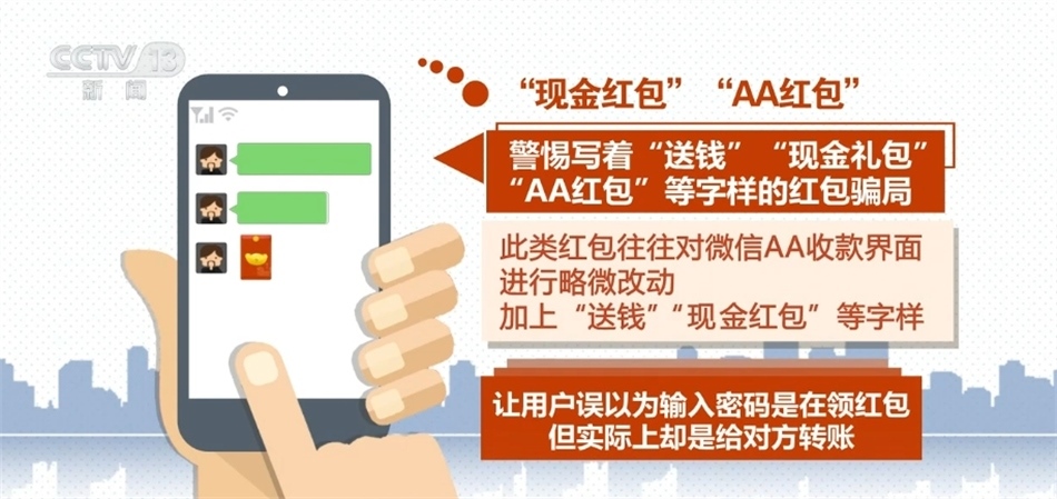 警惕寫(xiě)著“送錢(qián)”“現(xiàn)金禮包”“AA紅包”等字樣的紅包騙局。此類(lèi)紅包往往對(duì)微信AA收款界面進(jìn)行略微改動(dòng),加上“送錢(qián)”“現(xiàn)金紅包”等字樣,讓用戶誤以為輸入密碼是在領(lǐng)紅包,但實(shí)際上卻是給對(duì)方轉(zhuǎn)賬。正規(guī)的微信紅包界面是橙紅色,領(lǐng)取紅包并不會(huì)進(jìn)入AA收款界面。