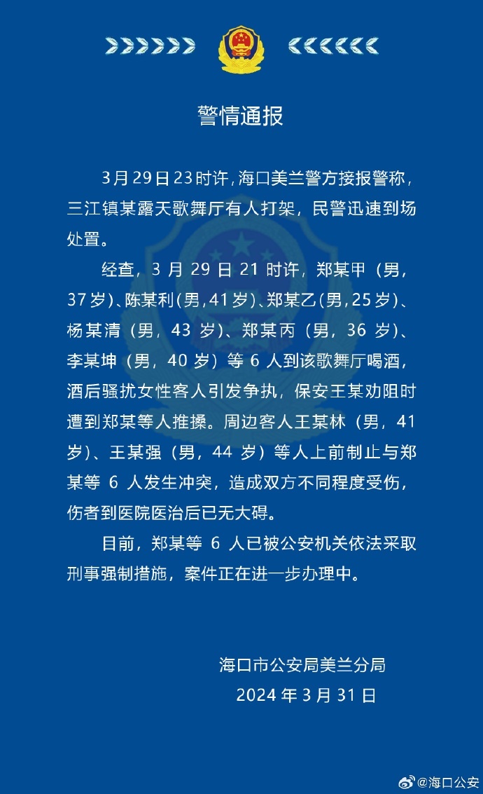 經(jīng)查,3月29日21時許,鄭某甲(男37歲)、陳某利(男,41歲)、鄭某乙(男,25歲)楊某清(男,43歲)、鄭某丙(男,36歲)、李某坤(男,40歲)等6人到該歌舞廳喝酒酒后騷擾女性客人引發(fā)爭執(zhí),保安王某勸阻時遭到鄭某等人推操。周邊客人王某林(男,4歲)、王某強(男,44歲)等人上前制止與鄭某等6人發(fā)生沖突,造成雙方不同程度受傷,傷者到醫(yī)院醫(yī)治后已無大礙。