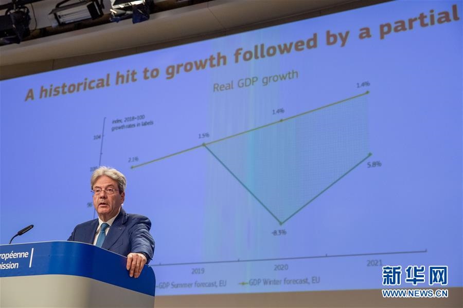 這是7月7日,負(fù)責(zé)經(jīng)濟(jì)事務(wù)的歐委會(huì)委員保羅·真蒂洛尼在位于比利時(shí)布魯塞爾的歐盟委員會(huì)總部就歐盟經(jīng)濟(jì)預(yù)測出席新聞發(fā)布會(huì)。歐盟7日發(fā)布夏季經(jīng)濟(jì)預(yù)測報(bào)告說,由于放松新冠疫情防控措施的步伐比原計(jì)劃緩慢,歐盟和歐元區(qū)今年經(jīng)濟(jì)萎縮程度將比此前預(yù)期更嚴(yán)重,明年復(fù)蘇也將更緩慢。新華社發(fā)(歐盟供圖)