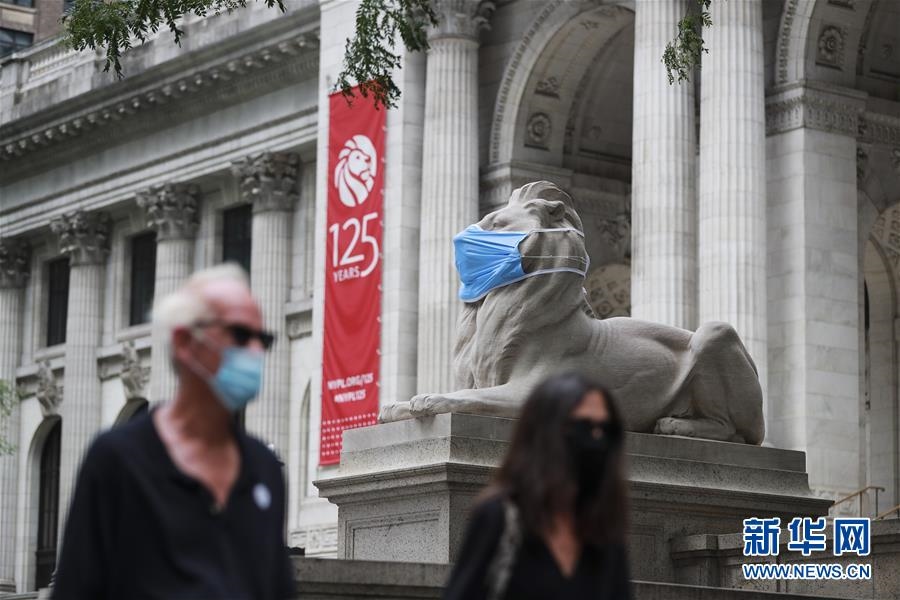 這是7月8日在美國紐約公共圖書館前拍攝的“戴”口罩的石獅子。新華社記者王迎攝