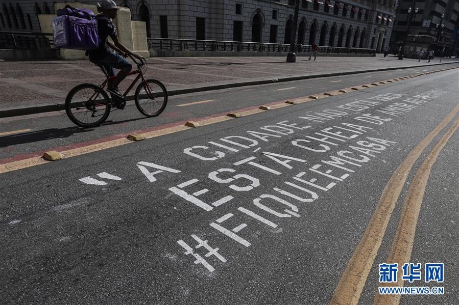 這是4月21日,巴西圣保羅市的一條道路上寫有“城市不是空的,而是充滿著鄰里間的關(guān)愛#待在家中”字樣。新華社發(fā)(拉赫爾·帕特拉索攝)