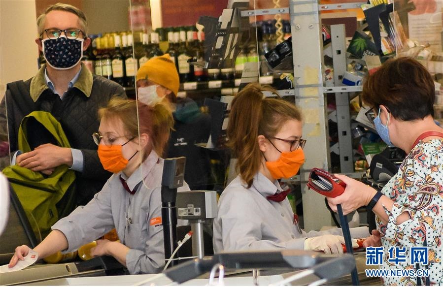 這是4月6日在德國耶拿一家超市拍攝的戴著口罩的收銀員和顧客。新華社發(fā)(凱文·福格特?cái)z)