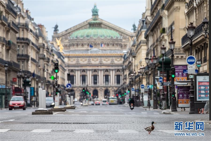 這是4月6日,在法國巴黎,一只鴨子在巴黎歌劇院前的大道上“溜達(dá)”。“禁足令”實(shí)施期間,不少動(dòng)物“溜達(dá)”到巴黎空蕩無人的大街上。新華社發(fā)(奧雷利安·莫里薩爾攝)