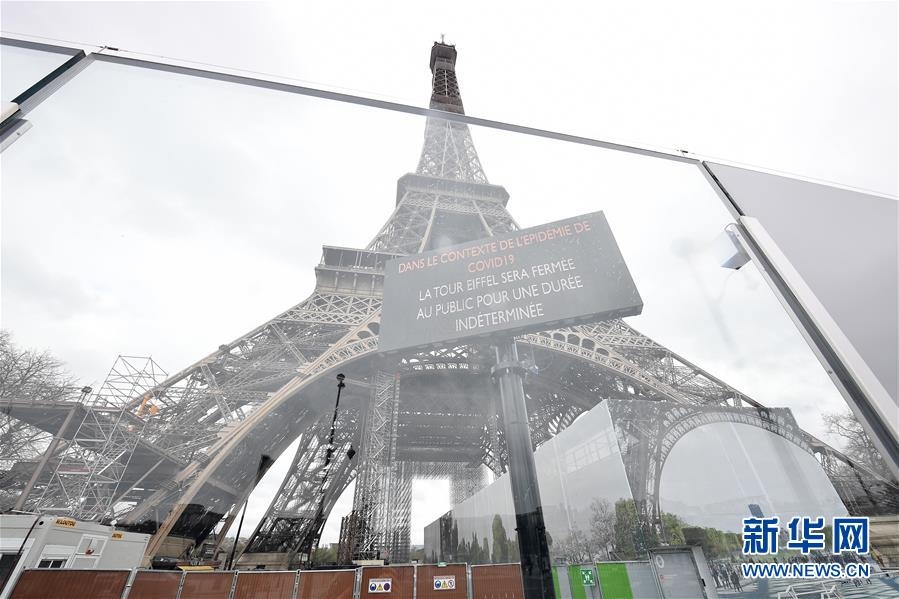 這是3月14日,在法國巴黎,埃菲爾鐵塔下豎立著“因新冠肺炎疫情而無限期關(guān)閉”的告示牌。新華社發(fā)(杰克·陳攝)