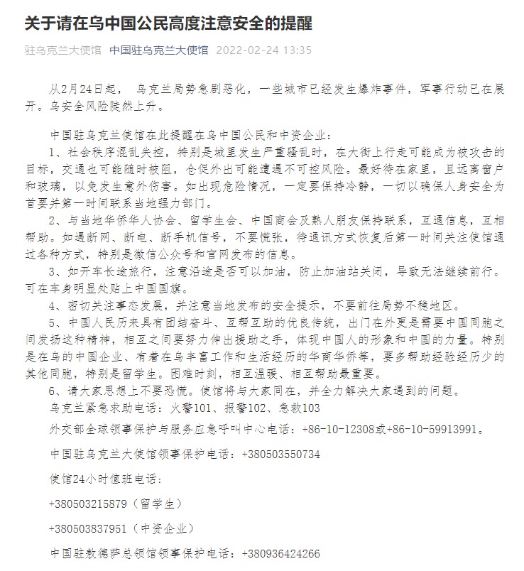 中國(guó)駐烏克蘭大使館領(lǐng)事保護(hù)電話:+380503550734