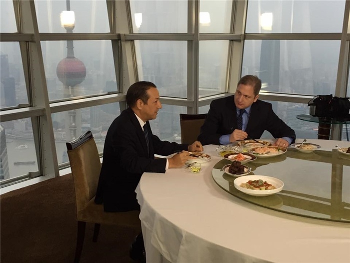 2016年6月,哈考特和香港君悅酒店副總裁理查德·格里夫斯在上海吃飯。圖片來源:哈考特社媒