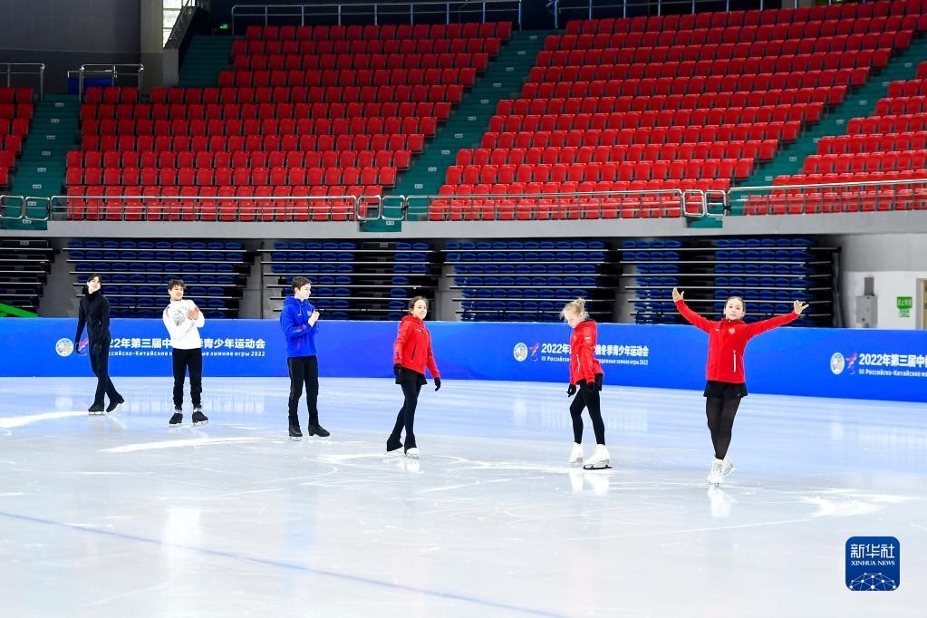 在長春五環(huán)體育館,參加第三屆中俄冬季青少年運(yùn)動會的俄羅斯花樣滑冰運(yùn)動員在賽前場地適應(yīng)性訓(xùn)練時向場邊的中國運(yùn)動員致意(2022年12月15日攝)。新華社記者 許暢 攝