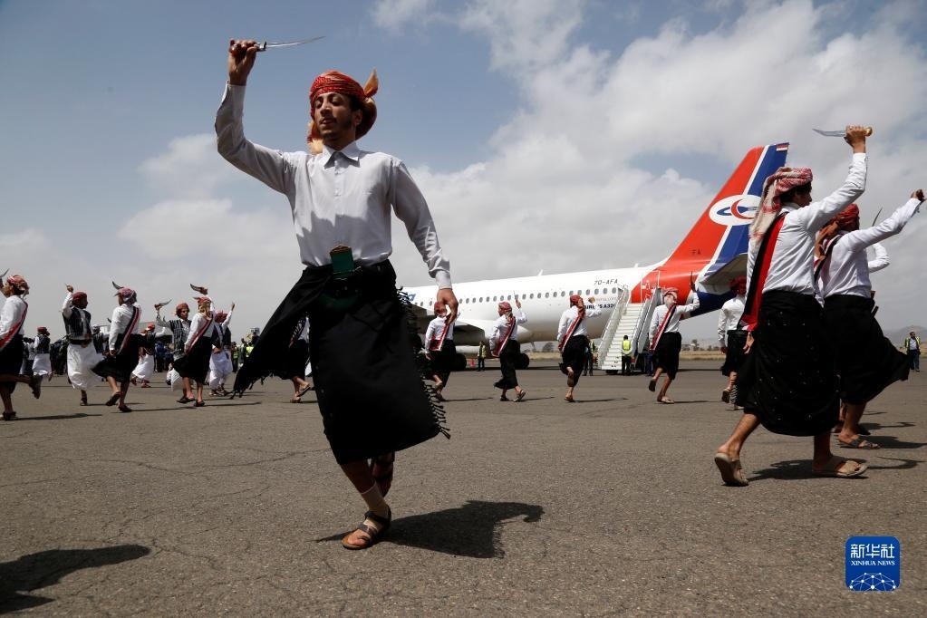 4月15日,在也門薩那機(jī)場(chǎng),人們?cè)跉g迎戰(zhàn)俘歸來的儀式上跳舞。