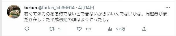 “只有年輕體力好的時候才能(這樣旅游),挺好的。在還有周游券的平成年代初期,我也這么干過?!?/p>