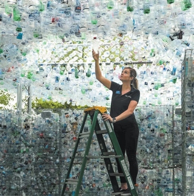 英國藝術(shù)家在倫敦動物園打造名為“廢棄物空間”的藝術(shù)裝置,鼓勵人們停止使用一次性塑料瓶??巳R爾·多赫蒂攝(人民視覺)