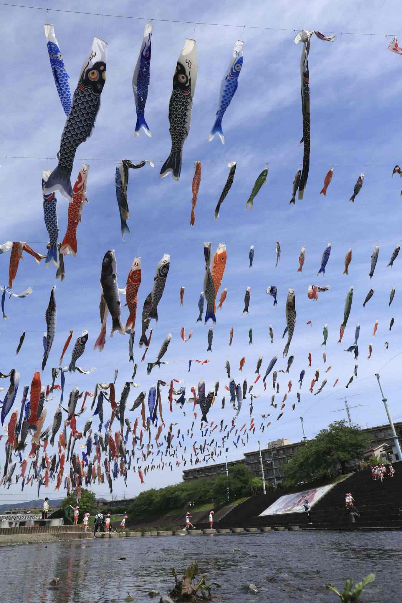 當(dāng)?shù)貢r(shí)間2023年4月28日,日本大阪,大約1000條鯉魚旗在高摫市的秋田川河上空飄揚(yáng),慶祝5月5日兒童節(jié)。視覺中國(guó)
