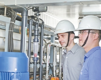 在巴西北里奧格蘭德州若昂卡馬拉市,中國國家電網(wǎng)巴西電力股份公司員工在檢查凈水設(shè)備。該苦咸水淡化公益項(xiàng)目讓800多個家庭喝上優(yōu)質(zhì)飲用水。 新華社記者 陳昊佺攝