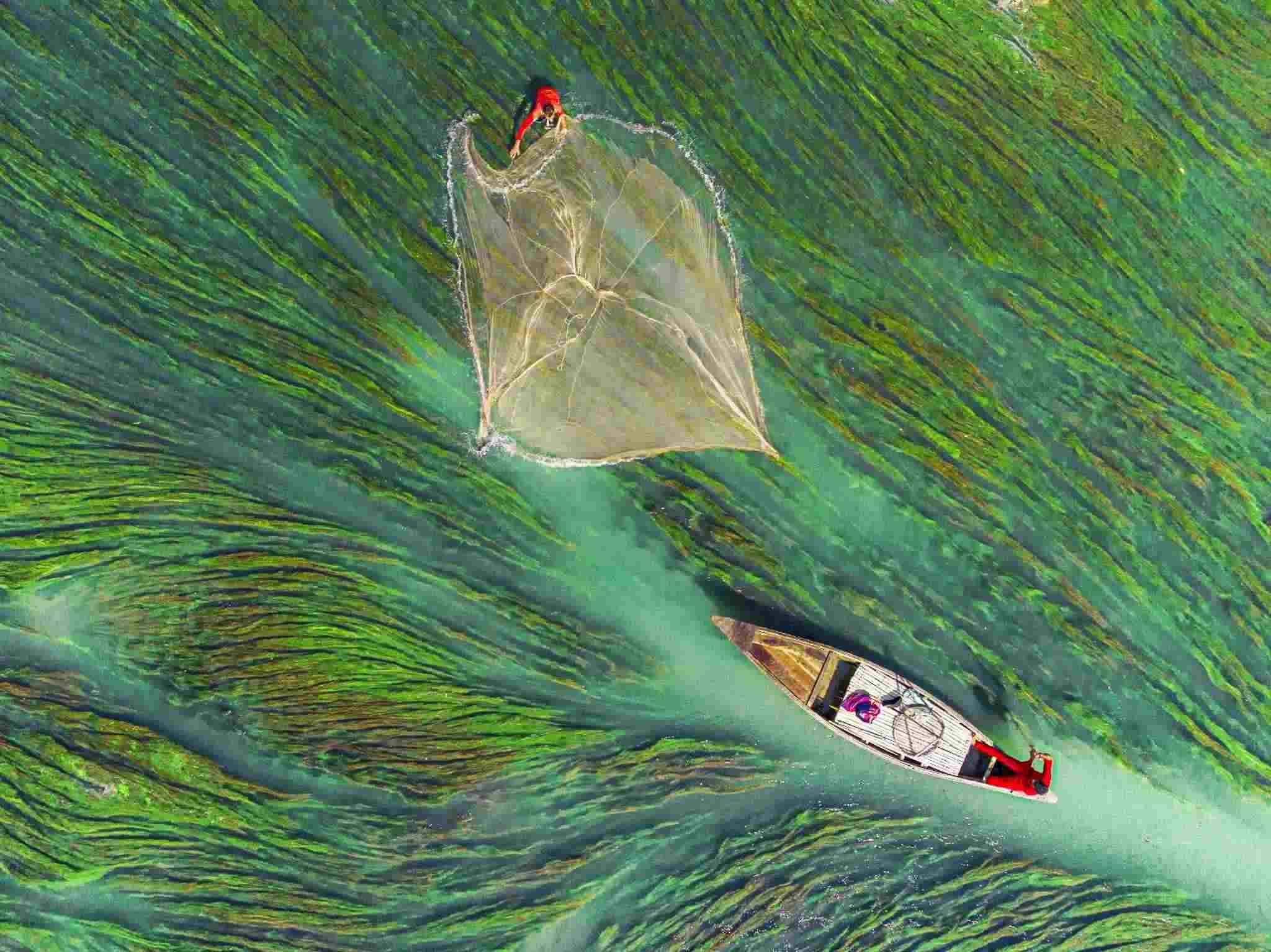 孟加拉拉杰沙希,漁民在河中撒網(wǎng)捕魚,周圍被多彩的水藻包圍。視覺中國