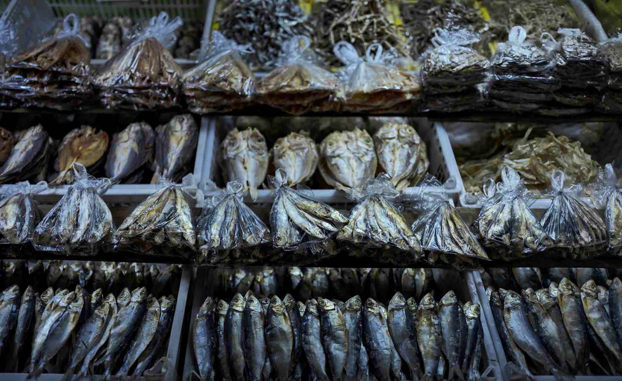 當(dāng)?shù)貢r(shí)間2023年4月19日,菲律賓馬尼拉菜市場上,用塑料袋包裹著的魚干。