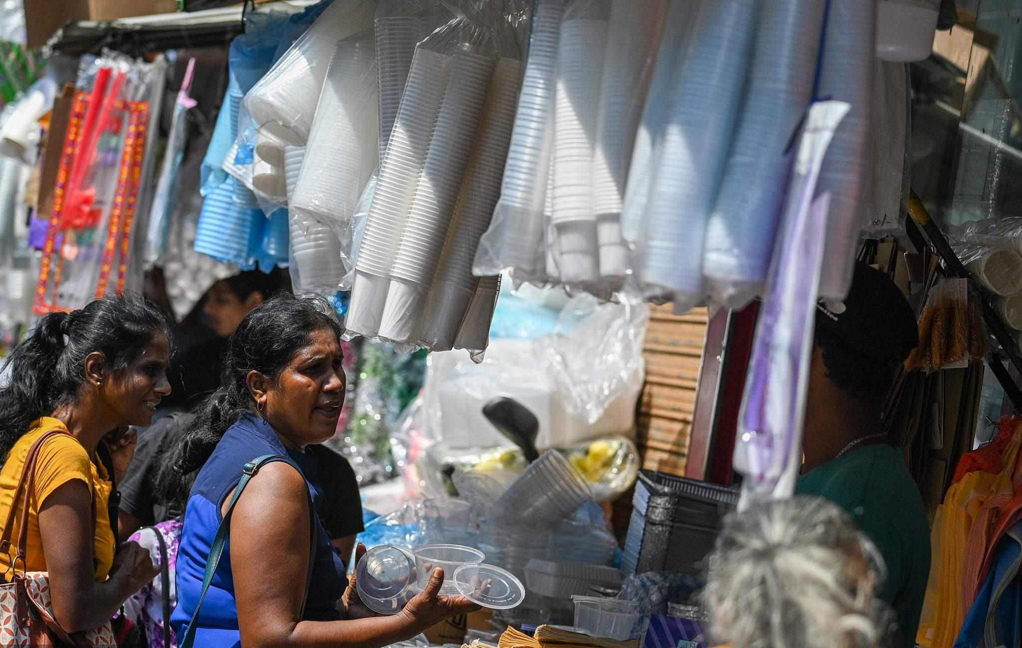 當(dāng)?shù)貢r(shí)間2023年2月14日,斯里蘭卡科倫坡市場的一家商店里,顧客在購買塑料餐具。