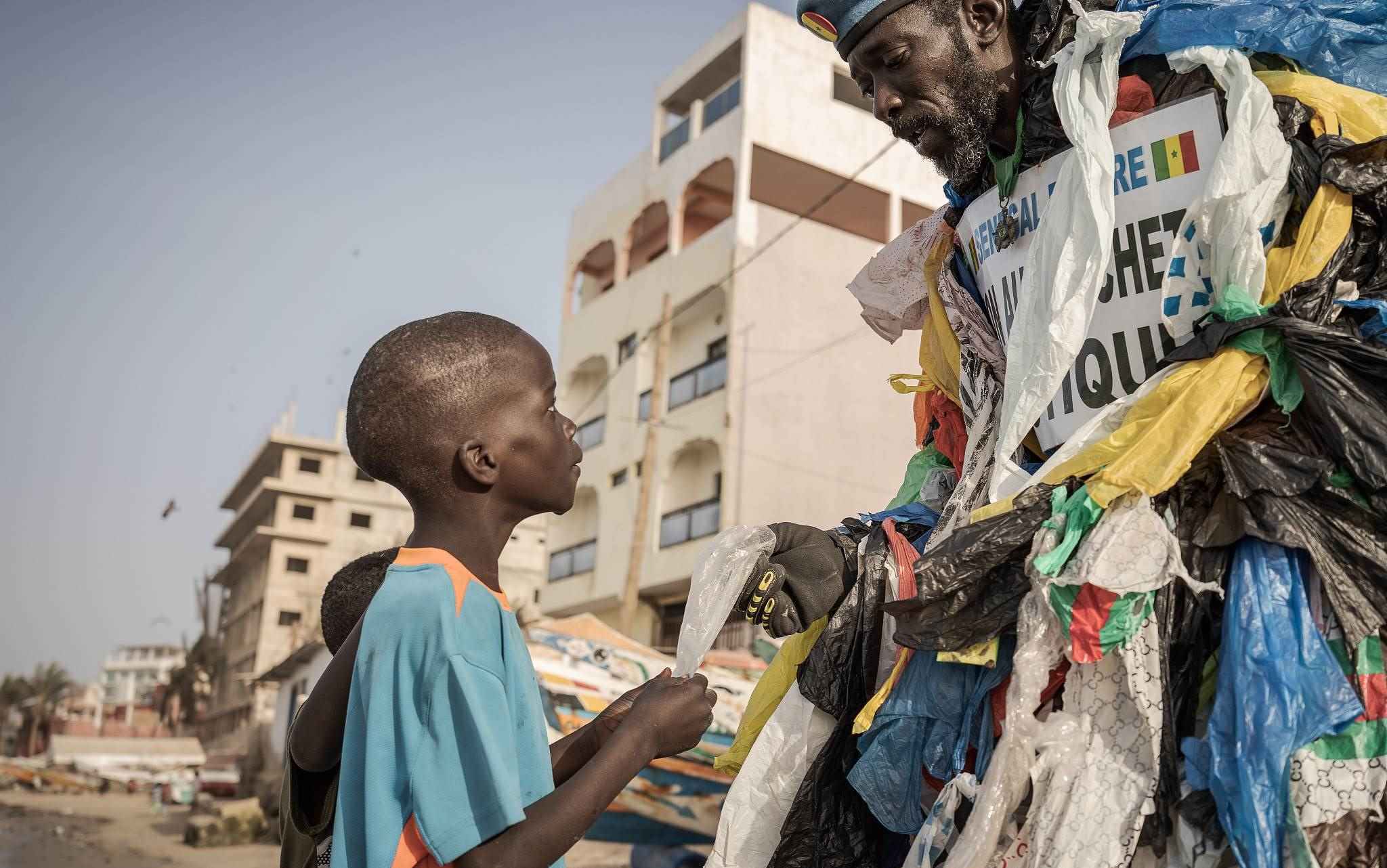 當(dāng)?shù)貢r(shí)間2023年4月5日,塞內(nèi)加爾達(dá)喀爾,49歲的塞內(nèi)加爾環(huán)?;顒蛹夷拧し?,被稱為“塑料人”,和一個孩子在海灘上散步時(shí)拿著一個塑料包裝,提醒人們注意使用一次性塑料的污染。