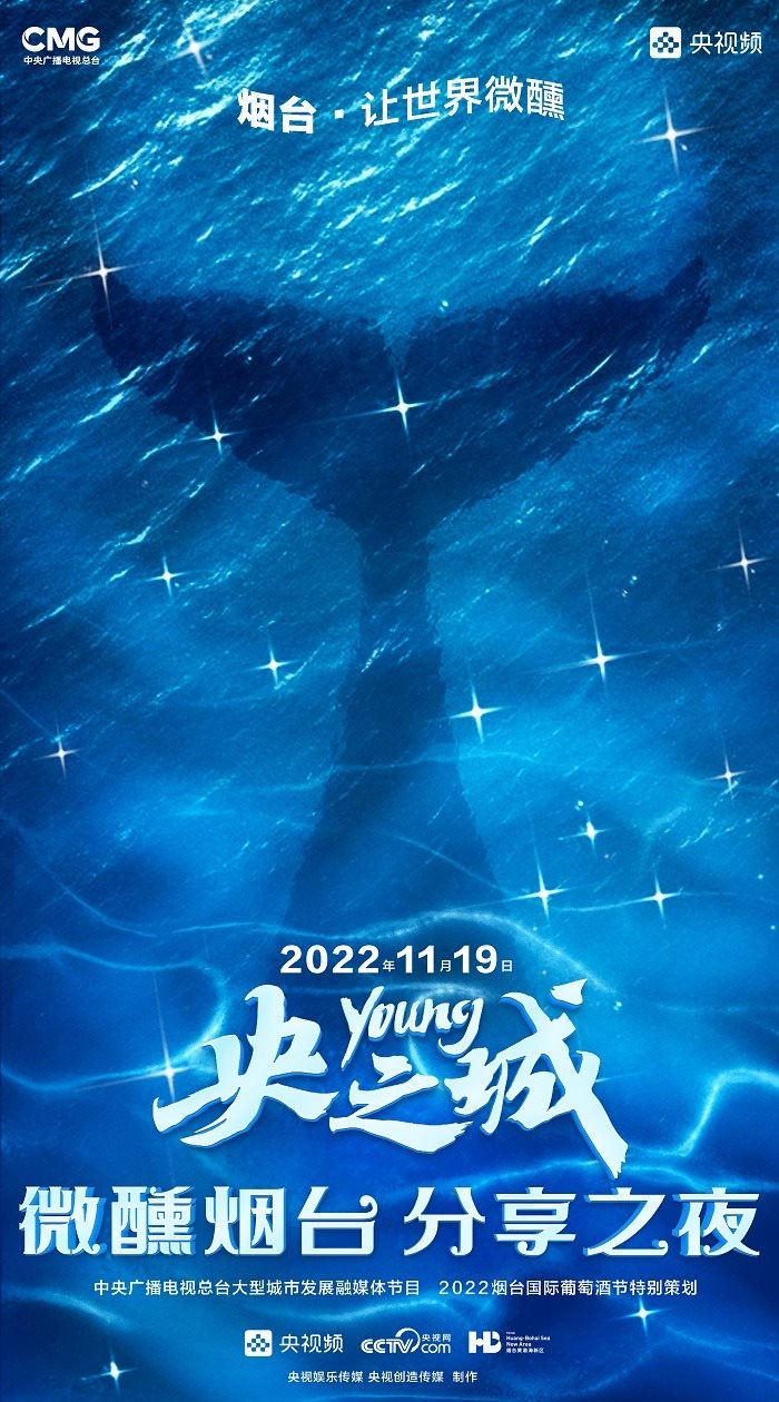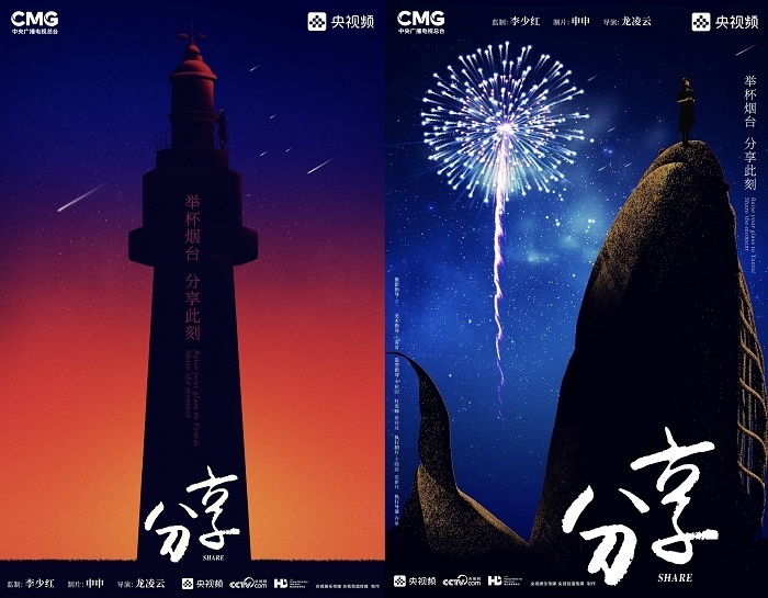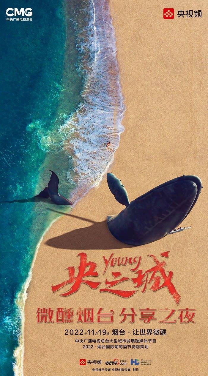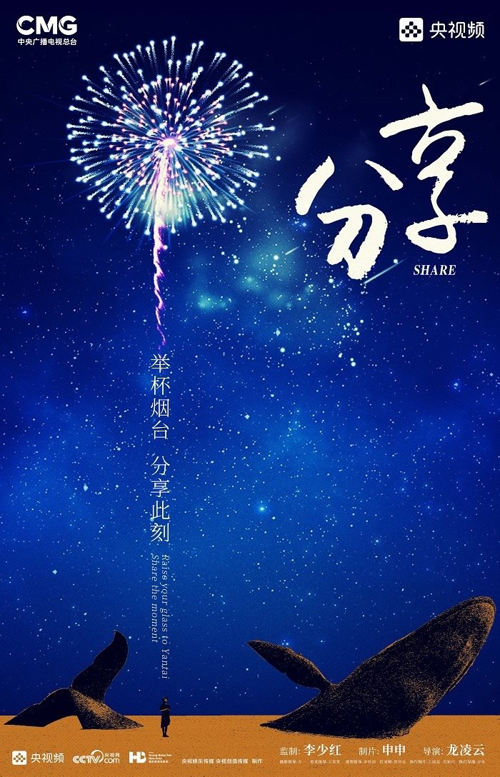 田雨峰在拍攝短片海報(bào)用圖的時(shí)候,首先確定了畫面中最突出的形象元素,同時(shí)也是交代短片故事發(fā)生地的地標(biāo)性雕塑——“孤獨(dú)的鯨“。這個(gè)雕塑如今是煙臺(tái)開(kāi)發(fā)區(qū)金沙灘的網(wǎng)紅打卡地,網(wǎng)友為其起名”鯨落“。碩大的鯨魚從淺海處躍出海面,魚頭和魚尾凌空飛躍,其身體的一部分似藏在沙灘里。這是一個(gè)在真實(shí)生活中不會(huì)出現(xiàn)的景象,充滿了動(dòng)畫般的奇幻想象,位于煙臺(tái)碧藍(lán)的海邊,又天然地帶上了一點(diǎn)浪漫的色彩。短片中”舉杯煙臺(tái),分享此刻“的Slogan綴在尾聲,分享的正是煙臺(tái)這座城市獨(dú)有的沙灘、夜空、煙火和人間。短片中可以娓娓道來(lái)般逐漸交代,但在海報(bào)里,二環(huán)用畫面底部金色沙灘上”孤獨(dú)的鯨“,畫面上方如大海般湛藍(lán)的星空,星空中綻放的煙花,鎖定了地球上唯一的煙臺(tái)。田雨峰鏡頭中短片主角的人物照被二環(huán)拼貼到童話般色彩斑斕的畫面里,被著意縮小了的黑色小女孩于是成為一切奇幻、浪漫想象的迸發(fā)之源,和世界分享一個(gè)妙趣橫生的想法。