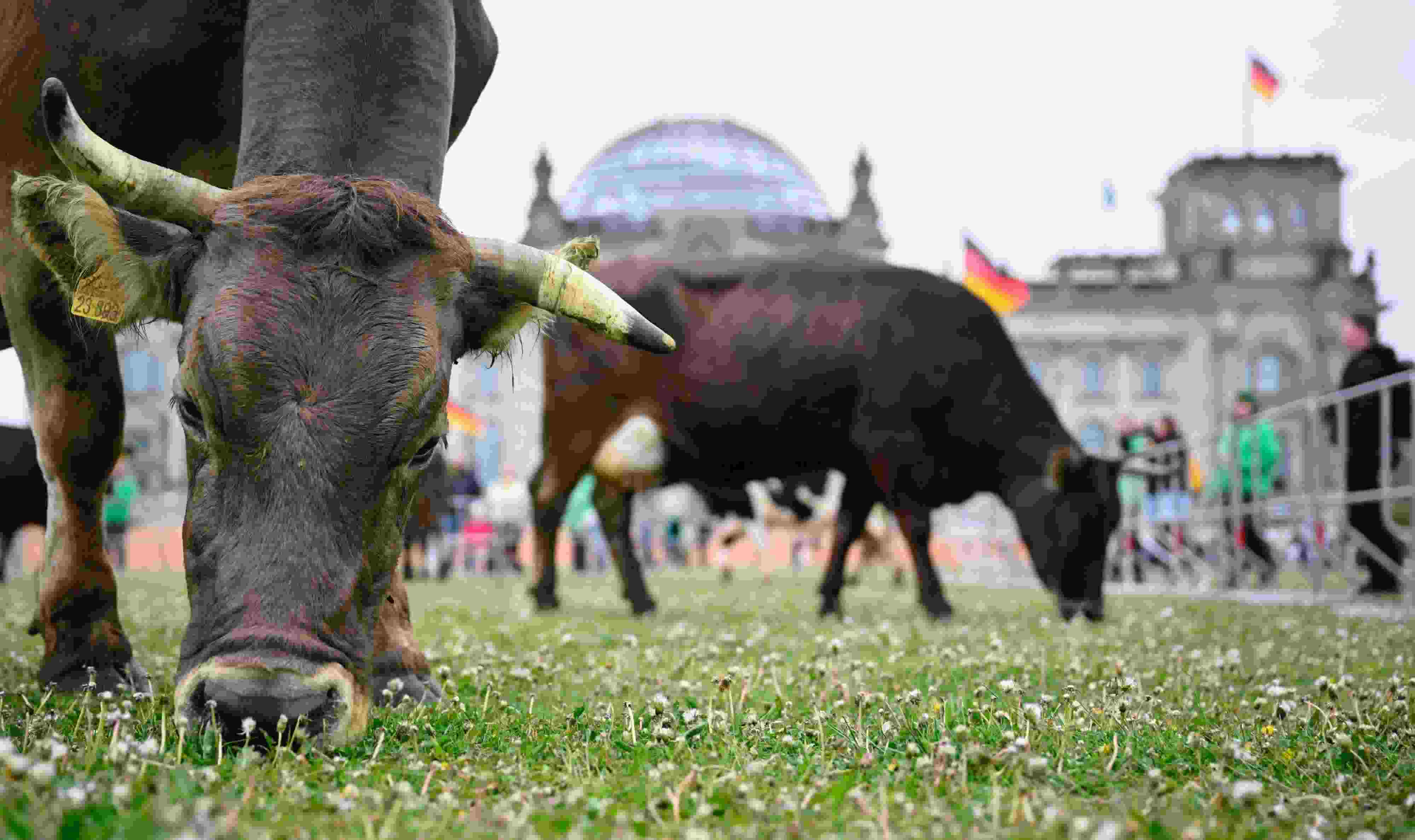 當?shù)貢r間2023年5月16日,德國柏林,牛群被驅趕到國會大廈前吃草。活動組織者希望通過這一行動,呼吁政治家們采取更多措施來促進牧場農(nóng)業(yè)。 視覺中國