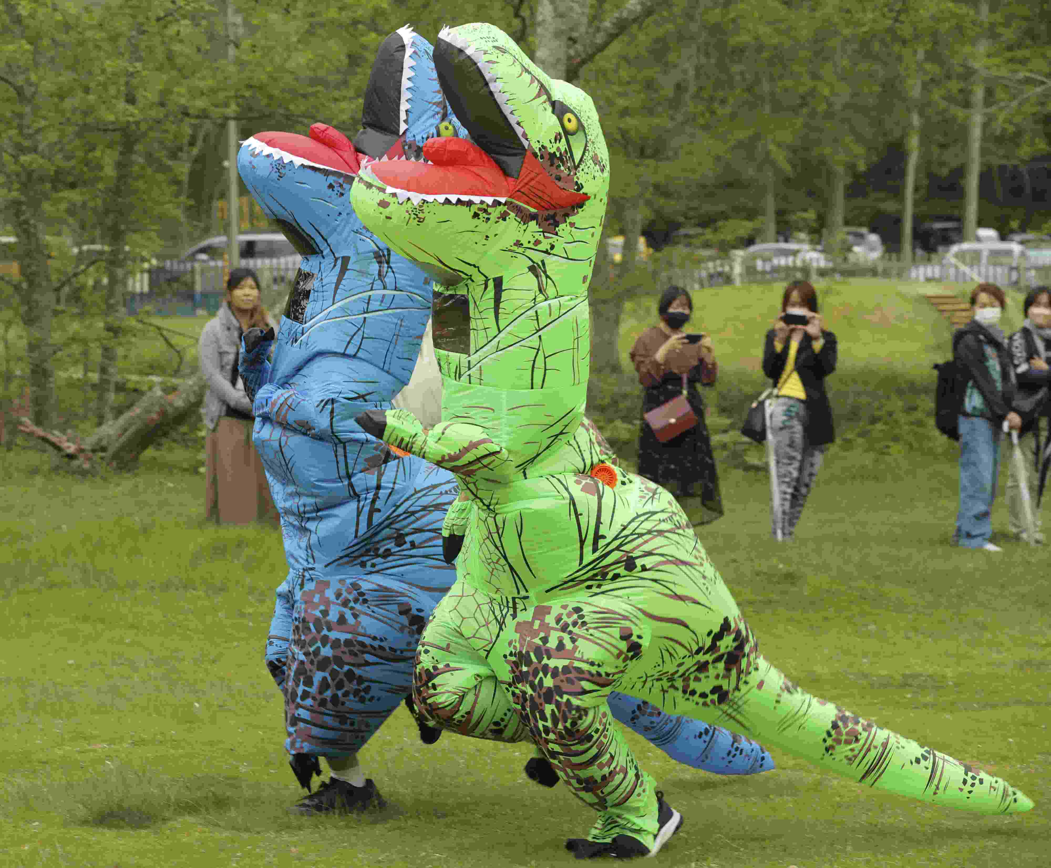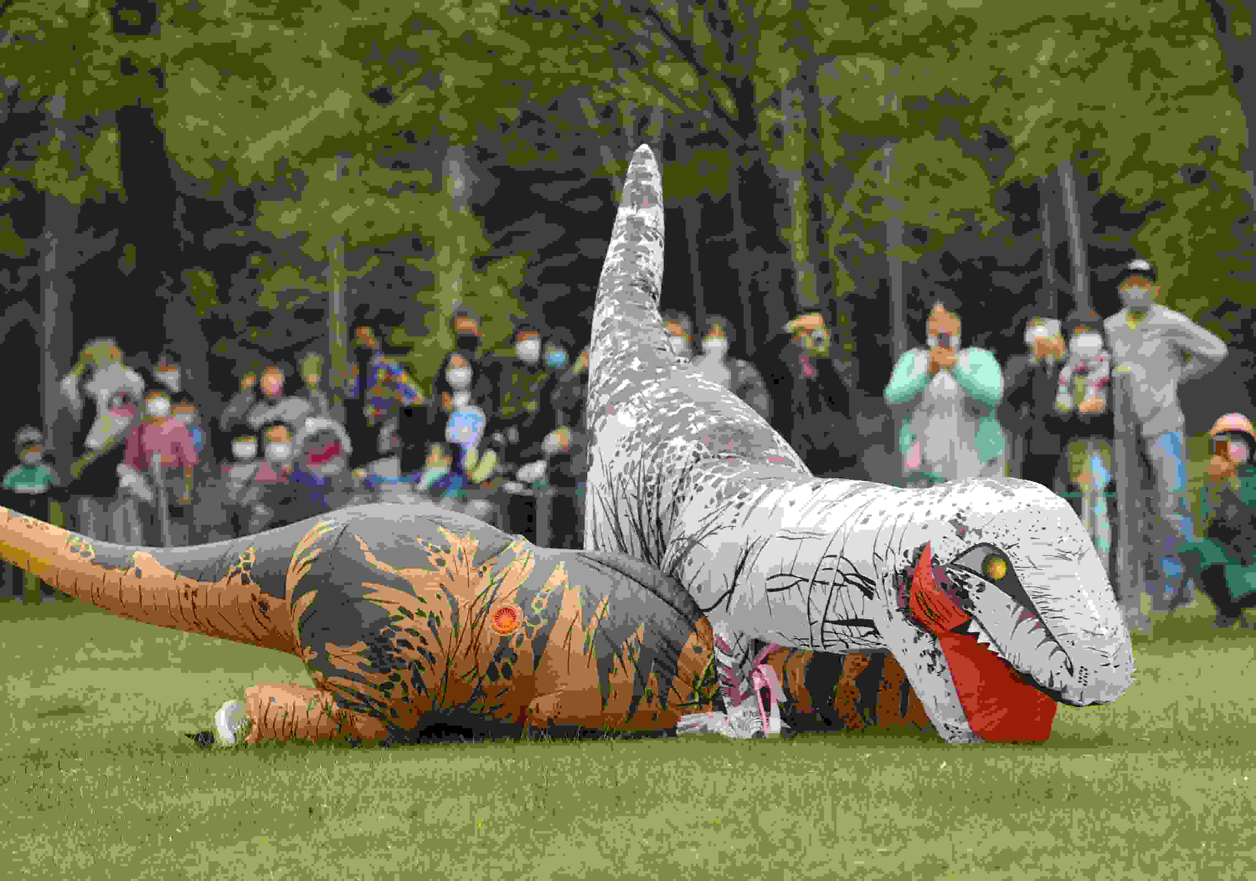 當(dāng)?shù)貢r(shí)間2023年5月28日,日本北海道苫小牧,身穿恐龍服裝的參賽者在約50米長(zhǎng)的跑道上賽跑。任何15歲以上的人都可以參加,但他們必須自己置辦恐龍服裝。 視覺(jué)中國(guó)