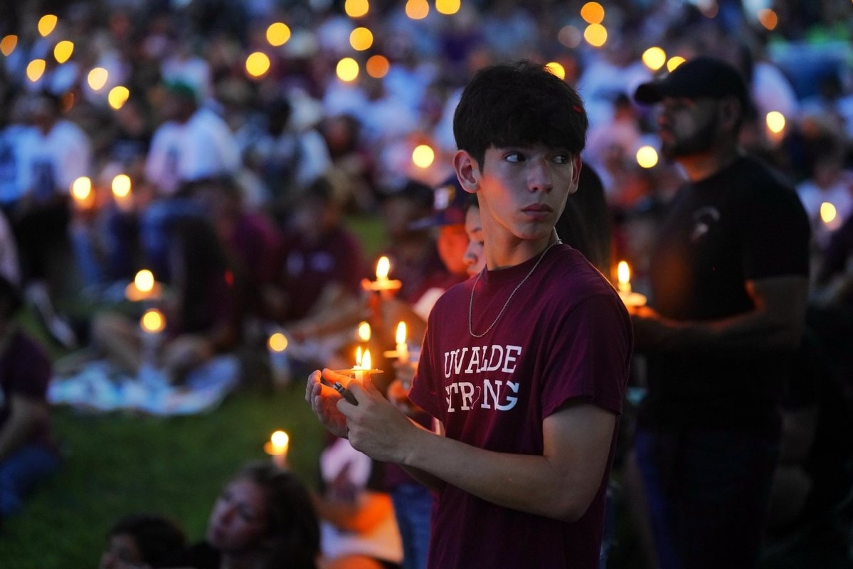 2023年5月24日,在美國得克薩斯州小城尤瓦爾迪,人們參加守夜儀式悼念校園槍擊遇害者。圖源:新華社