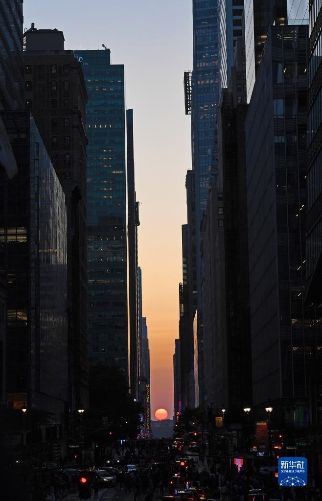 當(dāng)日,紐約出現(xiàn)“曼哈頓懸日”景觀?!奥D懸日”是紐約市標(biāo)志性景觀,每年5月和7月出現(xiàn)兩次,指日落時(shí)太陽(yáng)正好出現(xiàn)在曼哈頓東西向街道正上方、似乎懸在兩側(cè)高樓大廈之間的戲劇性畫(huà)面。新華社記者 李睿 攝