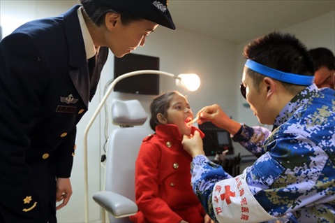 2019年12月9日,在中國海軍“和平方舟”號醫(yī)院船上,口腔科醫(yī)生給孟加拉國的9歲女孩沁做檢查。新華社發(fā)(吳煒權(quán) 攝)