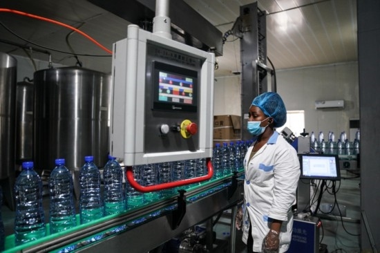 9月9日,當?shù)貑T工在位于加蓬首都利伯維爾的歐來源純凈水廠生產線上工作。新華社記者韓旭攝