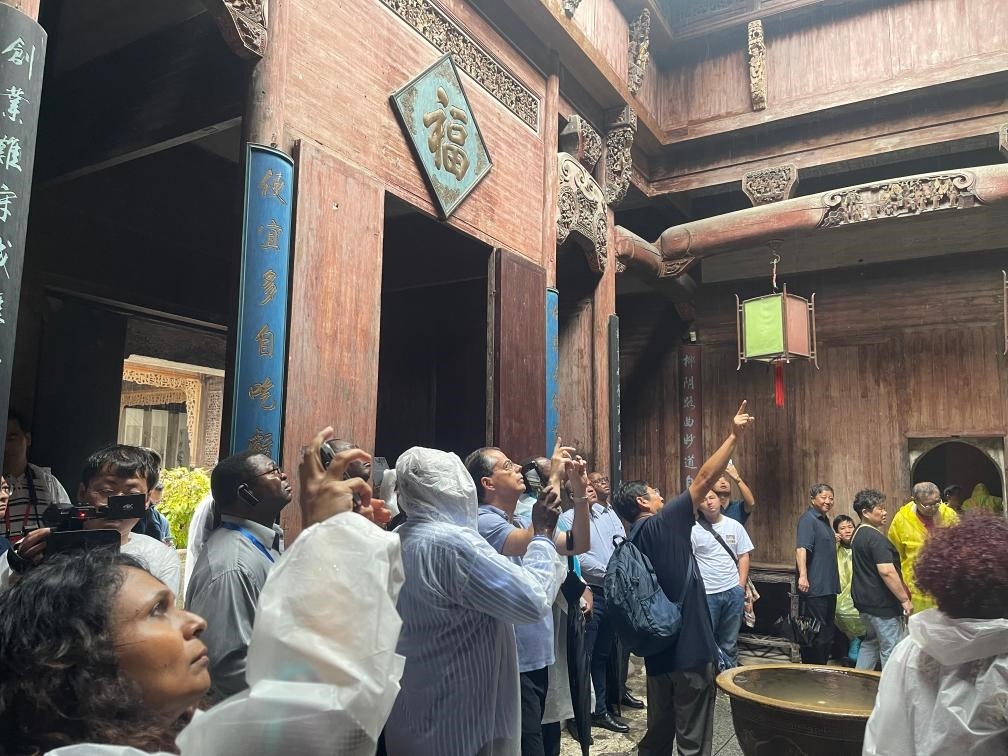 秋雨連綿中,使節(jié)們來到世界文化遺產(chǎn)地宏村。被雨水打濕的蓮葉搖曳在微涼的風(fēng)中,青石板路在雨中泛起柔和的光,徽派建筑的粉墻黛瓦在雨中顯得格外寧靜淡雅,一幅悠然的水墨畫躍然眼中。樂敘堂、敦厚堂、敬德堂……古建筑承載的厚重中華文化令使節(jié)們沉醉其中。