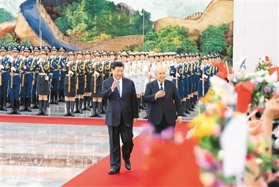 | 七月十八日下午,國家主席習(xí)近平在北京人民大會堂同來華進行國事訪問的阿爾及利亞總統(tǒng)特本舉行會談。這是會談前,習(xí)近平在人民大會堂北大廳為特本舉行歡迎儀式。新華社記者 翟健嵐攝 |
