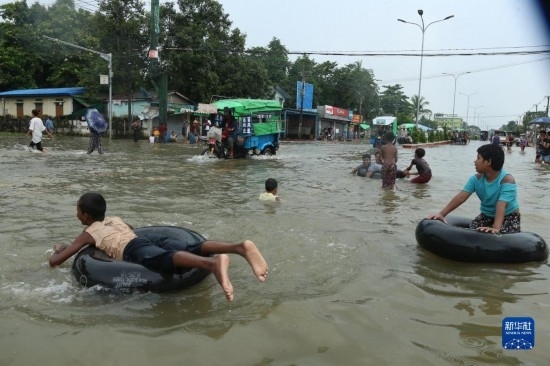 這是8月12日拍攝的緬甸勃固鎮(zhèn)洪災(zāi)區(qū)。新華社發(fā)(苗覺(jué)梭攝)