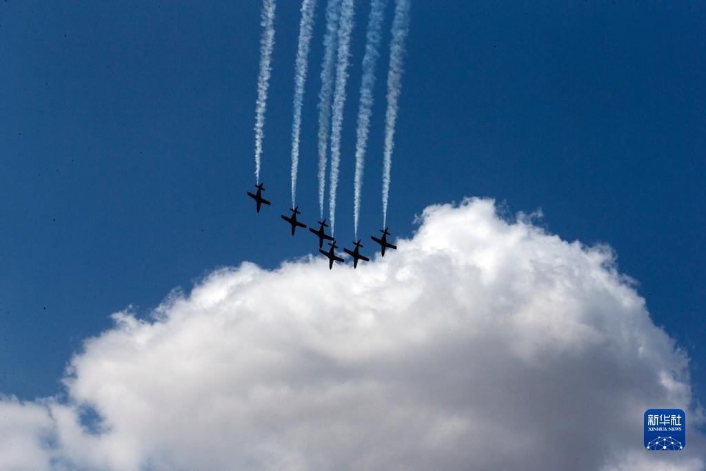 9月2日,在希臘塔納格拉空軍基地的雅典飛行周上,來自阿聯(lián)酋的飛行表演隊進行表演。新華社發(fā)(馬里奧斯·羅洛斯攝)
