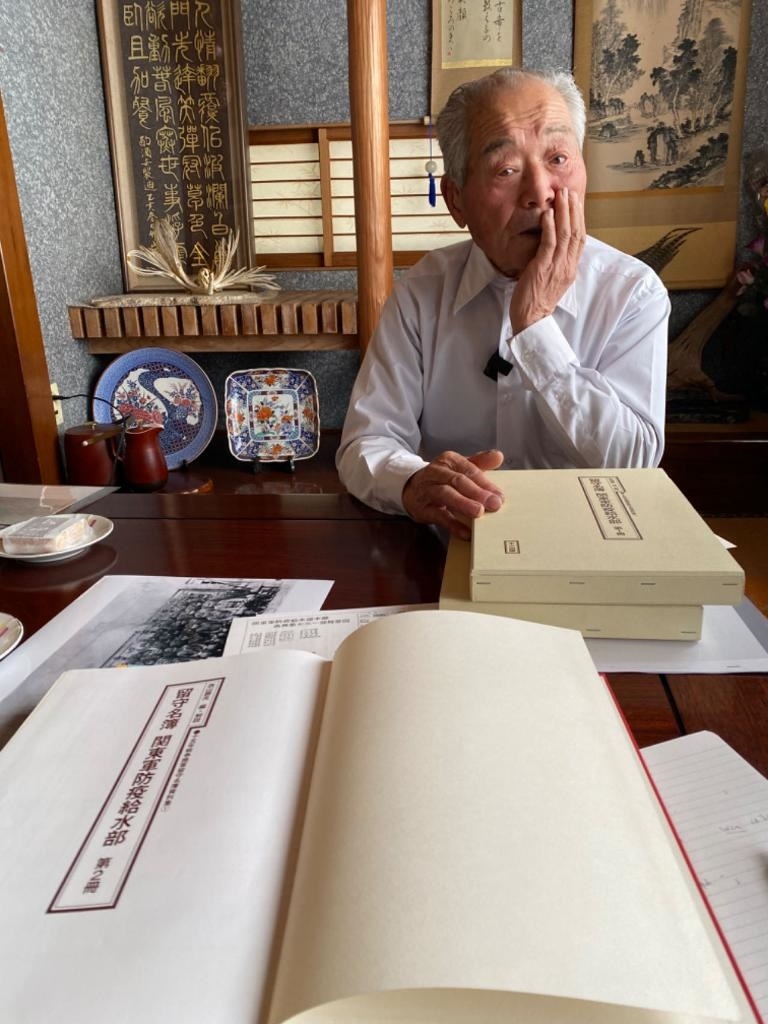 1月13日,在日本長野縣飯?zhí)锸校盀榱撕推降男胖輵?zhàn)爭展實行委員會”會長及“飯?zhí)锸泻推劫Y料收集委員會”會長久保田昇在家中接受采訪。新華社記者郭丹攝
