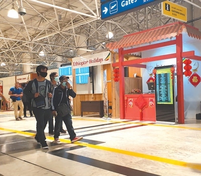 旅客經(jīng)過埃塞俄比亞博萊國際機(jī)場(chǎng)內(nèi)的中文服務(wù)臺(tái)。本報(bào)記者 萬 宇攝