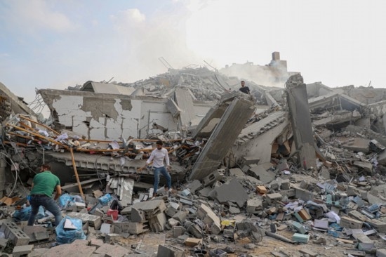 10月8日,在加沙城,巴勒斯坦人查看以色列空襲后的建筑廢墟。新華社發(fā)(里澤克·阿卜杜勒賈瓦德攝)