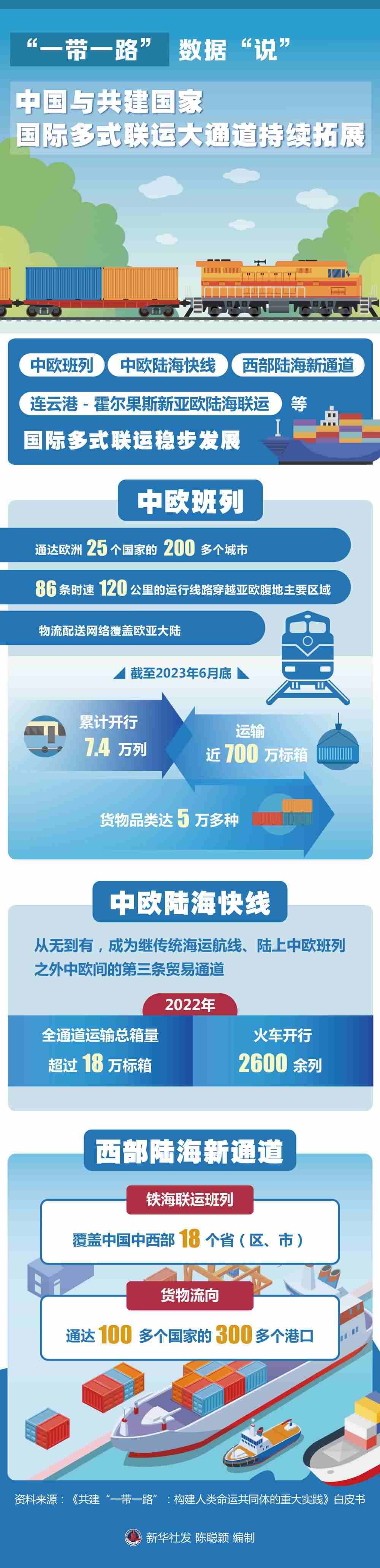 國際多式聯(lián)運(yùn)大通道持續(xù)拓展。中歐班列、中歐陸海快線、西部陸海新通道、連云港-霍爾果斯新亞歐陸海聯(lián)運(yùn)等國際多式聯(lián)運(yùn)穩(wěn)步發(fā)展。中歐班列通達(dá)歐洲25個國家的200多個城市,86條時速120公里的運(yùn)行線路穿越亞歐腹地主要區(qū)域,物流配送網(wǎng)絡(luò)覆蓋歐亞大陸;截至2023年6月底,中歐班列累計開行7.4萬列,運(yùn)輸近700萬標(biāo)箱,貨物品類達(dá)5萬多種,涉及汽車整車、機(jī)械設(shè)備、電子產(chǎn)品等53大門類,合計貨值超3000億美元。中歐陸海快線從無到有,成為繼傳統(tǒng)海運(yùn)航線、陸上中歐班列之外中歐間的第三條貿(mào)易通道,2022年全通道運(yùn)輸總箱量超過18萬標(biāo)箱,火車開行2600余列。西部陸海新通道鐵海聯(lián)運(yùn)班列覆蓋中國中西部18個省(區(qū)、市),貨物流向通達(dá)100多個國家的300多個港口。