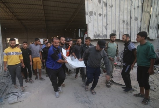 10月15日,在加沙地帶南部城市拉法,人們從遭以色列空襲后的受損建筑中抬出遇難者遺體。新華社發(fā)(哈立德·奧馬爾攝)