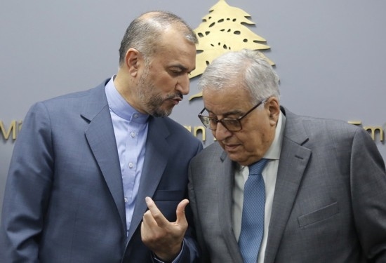 10月13日,伊朗外長(zhǎng)阿卜杜拉希揚(yáng)(左)和黎巴嫩外長(zhǎng)哈比卜在黎巴嫩首都貝魯特出席記者會(huì)。新華社記者劉宗亞攝