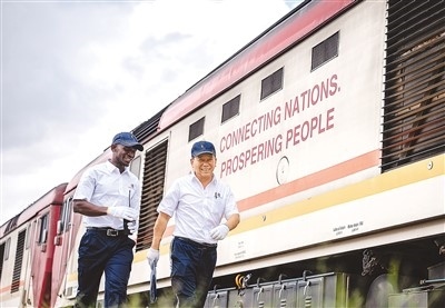 在肯尼亞內(nèi)羅畢,非洲之星鐵路運營公司機輛部的火車駕駛員(右)與學員從蒙內(nèi)鐵路機車旁走過。新華社記者 王冠森攝