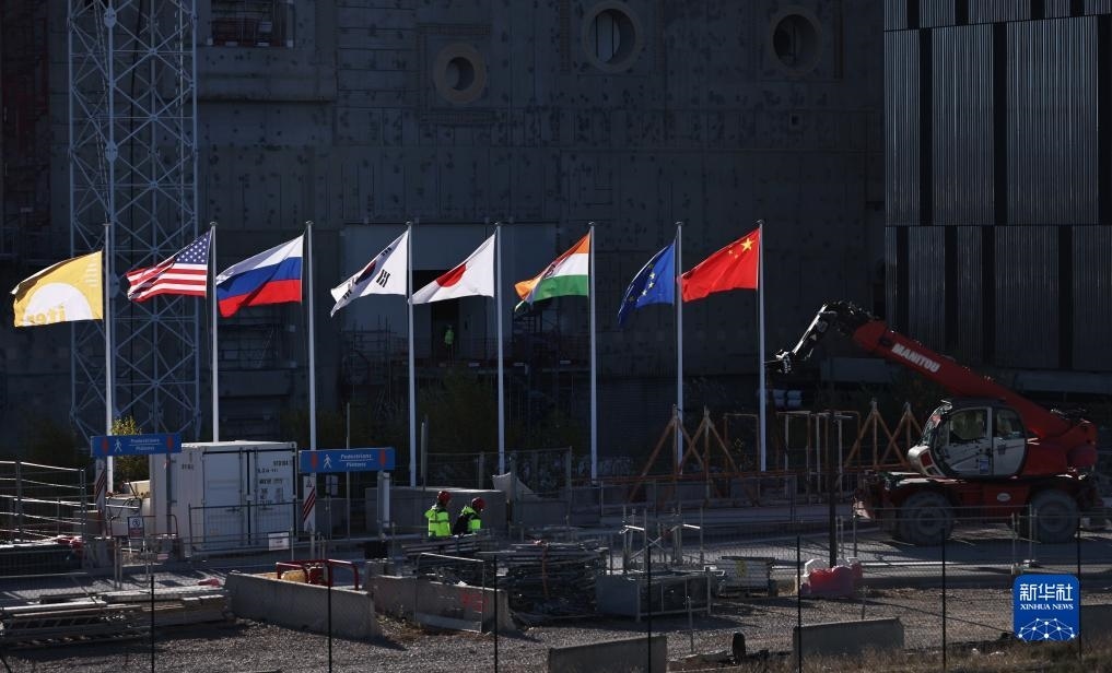?11月24日,在位于法國圣保羅-萊迪朗斯的國際熱核聚變實驗反應堆(ITER)的建造廠房外,中國、歐盟、印度、日本、韓國、俄羅斯、美國七個參與方的旗幟和ITER組織的旗幟迎風飄揚。新華社記者 高靜 攝