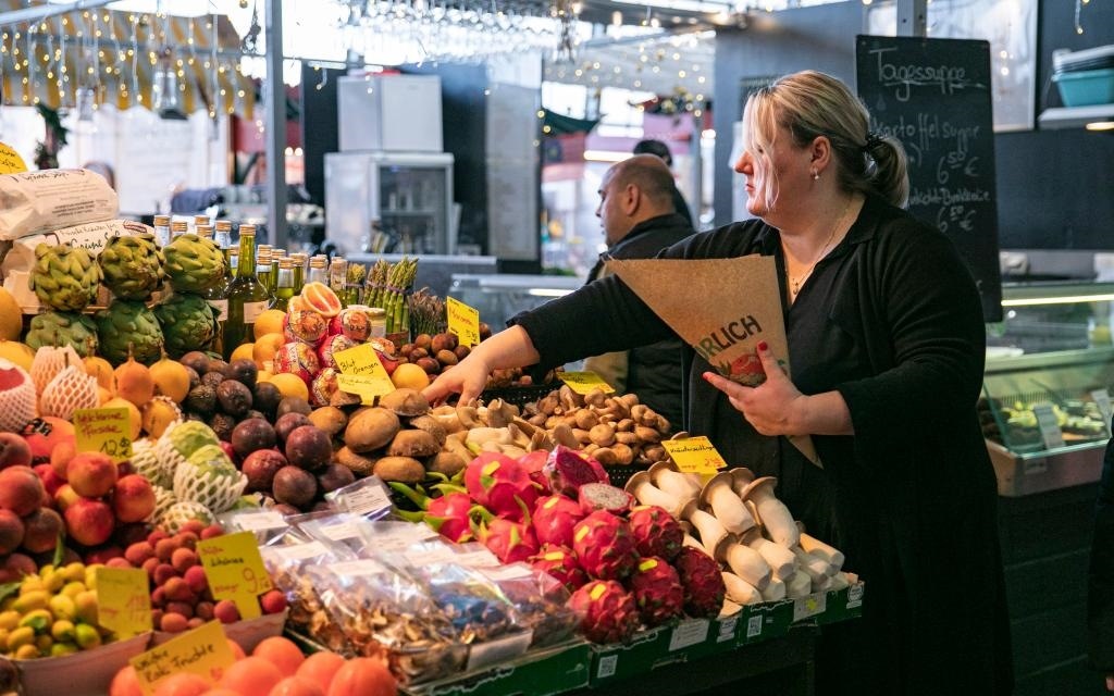 12月20日,在德國(guó)法蘭克?!靶∈袌?chǎng)大廳”,一名攤主為顧客挑選水果。新華社記者張帆攝
