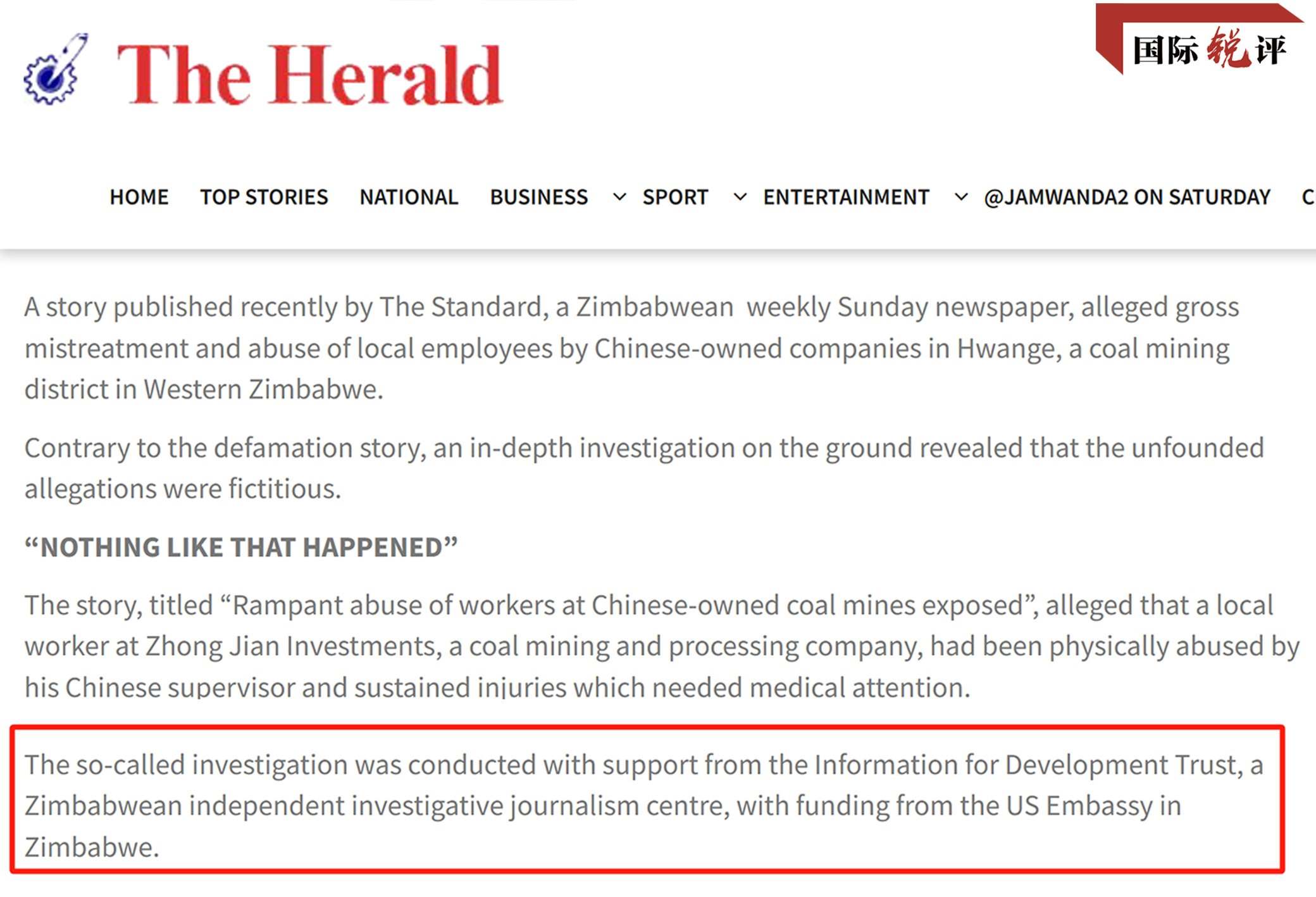2022年5月,津巴布韋媒體《標(biāo)準(zhǔn)報》發(fā)布了一篇報道,污蔑中國礦企虐待當(dāng)?shù)貑T工,稱這名員工“受傷送醫(yī),還被解雇了”。這家媒體稱,報道是和津巴布韋一個名叫“信息促進(jìn)發(fā)展信托基金(IDT)”的機構(gòu)合作完成的。然而很快,津巴布韋《先驅(qū)報》就發(fā)文,用大量事實證明,這名員工只是和中方員工發(fā)生了小口角,并沒有被毆打,也沒有被解雇。