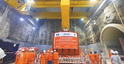 2023年6月10日,工人在巴基斯坦蘇吉吉納里水電站吊裝最后一臺機組轉子。中國能建葛洲壩海投公司供圖