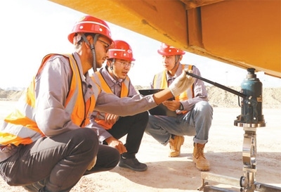 在阿布基爾集裝箱碼頭項(xiàng)目,中方員工向埃方新入職員工(左)講授級配碎石檢測知識(shí)。史筱迪攝