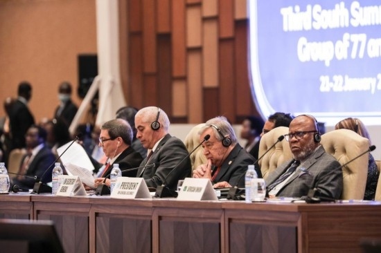 1月21日,聯(lián)合國(guó)秘書長(zhǎng)古特雷斯(右二)參加在烏干達(dá)首都坎帕拉舉行的“77國(guó)集團(tuán)和中國(guó)”第三屆南方首腦會(huì)議。 新華社發(fā)(阿佳拉·納瓦達(dá)攝)